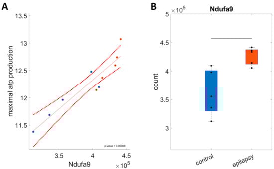 The unchanged ATP/O2 ratio, the higher redox state at high ATP demand, and the unchanged utilization of glucose under resting conditions all indicate that the changes in maximal ATP production capacity are not due to a selective increase in glycolytic activity but rather a coordinated increase in the capacity of the respiratory chain and oxidative phosphorylation. To better understand the underlying enzymatic pattern leading to the increased ATP production capacity, we identified 58 out of 105 proteins belonging to the respiratory chain and the oxphos system that significantly correlate with the ATP production capacity. Figure 4 shows an example of Ndufa9, a subunit of complex I of the respiratory chain. As can be seen in Figure 4A, an increase in Ndufa9 is strongly associated with maximal ATP production (p = 0.00006). Figure 4B shows the distribution of Ndufa9 in the individual samples across the two groups. There is a significantly higher abundance in the epilepsy than in the control group. The corresponding data for all 58 proteins can be found in the Supplementary Table S1. Out of the 58 proteins, only one (Ak5) is negatively associated and 57 are positively correlated with the maximal ATP production capacity. Ak5 is the adenylate kinase 5, catalyzing the equilibrium between ATP, ADP, and AMP, important for the indication of ATP availability but not per se for ATP production. Of the significantly associated proteins, 34 are significantly increased in the epilepsy group and only Ak5 is significantly decreased (p < 0.05), with another nine proteins tending to be increased in the epilepsy group (p < 0.1). This shows that increased ATP production capacity is the effect of a highly coordinated upregulation of enzymes belonging to the respiratory chain and the oxphos system.