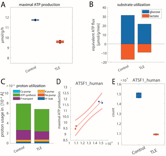 Metabolic alterations in patients with temporal lobe epilepsy (TLE) [13]. (A) Maximal ATP production capacity. The control group is depicted in blue, epilepsy group in orange. (B) Mean glucose utilization and lactate production rates are decreased in the epilepsy group vs. the control group. Positive values correspond to uptake rates, while negative values depict release rates. The values for the individual samples are given in Supplementary Figure S4A. (C) Mean mitochondrial proton utilization for control and epilepsy groups. The size of the different colored bars indicates the magnitude of the different processes (light blue: calcium pumping; green: FOF1-ATPase; purple: phosphate transport; yellow: potassium pumping; red: sodium pumping; dark blue: proton leakage). The values for the individual samples are given in Supplementary Figure S4B. (D,E) Example of a functional protein significantly associated with ATP production capacity. AT5F1, a subunit of ATP synthase, is significantly associated with ATP production capacity over all samples (p-value < 0.01 via linear regression) and is reduced in TLE. The values for the individual samples are given in Table S3.
