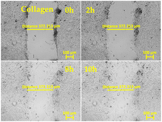 In our experiments, primary mouse skin fibroblasts (pMSFs) were seeded until a confluent layer was achieved on untreated glass slides or slides covered with LPP films or collagen. The samples were then scratched and placed under an inverted phase-contrast microscope (Carl Zeiss AG, Oberkochen, Germany) for 20 h of live imaging. Figure 1, Figure 2, Figure 3, Figure 4 and Figure 5 present images depicting the dynamics of wound closure for the control, collagen, 1L6 LPP film, 8L6 LPP film, and CoP LPP film, respectively. In each figure, pictures taken at four time points are presented: 0, 2, 8, and 10 h. Filming was performed for 20 h for each sample, but, as it is clearly visible from Figure 1, Figure 2, Figure 3, Figure 4 and Figure 5, after 10 h, the “wound” was already closed in all instances. For each sample, the speed of wound closure was calculated based on the initial width between the wound edges and the exact time of gap repopulation.