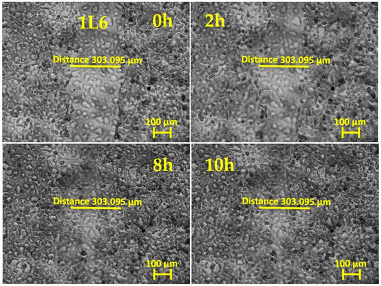 In vitro “wound” healing model. Primary mouse skin fibroblasts on a 1L6 LPP film-covered slide (after 24 h of incubation). After creating the “scratch”, the time-lapse imaging was performed every 10 min for 20 h using the inverted phase-contrast microscopy mode. The presented images are frames cut from the recordings and taken 0, 2, 8, and 10 h after scratching. The initial ‘wound’ width (distance across the scratch) was 303.095 μm, measured with Zen 3.0 software.