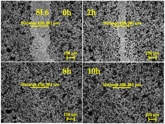 In vitro “wound” healing model. Primary mouse skin fibroblasts on an 8L6 LPP film-covered slide (after 24 h of incubation). After creating the “scratch”, the time-lapse imaging was performed every 10 min for 20 h using the inverted phase-contrast microscopy mode. The presented images are frames cut from the recordings and taken 0, 2, 8, and 10 h after scratching. The initial ‘wound’ width (distance across the scratch) was 254.408 μm, measured with Zen 3.0.
