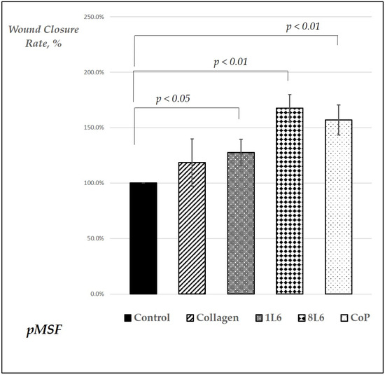 Wound closure rate for pMSFs. The data are presented as a percentage relative to the control (control set as 100%), with three as the minimum number of experiments in each case. The data are shown as mean values (n = 3–5), with error bars representing the standard error of mean (SEM). Statistically significant differences compared to the control are indicated by the corresponding p-values displayed above the bars.