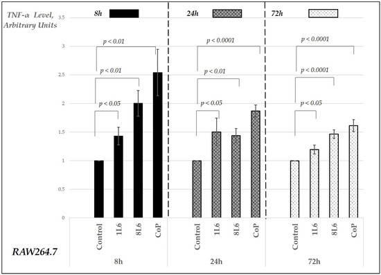 Secreted TNF-α levels in RAW264.7 cell cultures grown on LPP films (1L6, 8L6, and CoP) after 8, 24, and 72 h of incubation. TNF-α levels are expressed in arbitrary units relative to the control (set to 1) and grouped by incubation time. Data represent mean values from a minimum of three experiments (n = 3–6), with error bars indicating the mean (SEM). Statistically significant differences compared to the control are indicated by the corresponding p-values displayed above the bars.