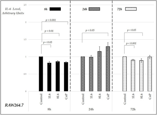 Secreted IL-6 levels in RAW264.7 cell cultures grown on LPP films (1L6, 8L6, and CoP), measured at 8, 24, and 72 h of incubation. IL-6 levels are expressed in arbitrary units relative to the control (set to 1) and grouped by incubation time. Data represent mean values from a minimum of three experiments (n = 3–6), with error bars indicating the mean (SEM). Statistically significant differences compared to the control are indicated by the corresponding p-values displayed above the bars.