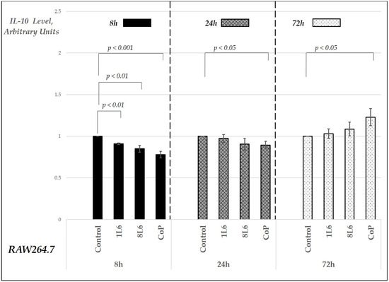 Secreted IL-10 levels in RAW264.7 cell cultures grown on LPP films (1L6, 8L6, and CoP), measured at 8, 24, and 72 h of incubation. IL-10 levels are expressed in arbitrary units relative to the control (set to 1) and grouped by incubation time. Data represent mean values from a minimum of three experiments (n = 3–6), with error bars indicating the mean (SEM). Statistically significant differences compared to the control are indicated by the corresponding p-values displayed above the bars.