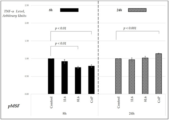 Secreted TNF-α levels in pMSF cell cultures grown on LPP films (1L6, 8L6, and CoP), measured at 8 and 24 h of incubation. TNF-α levels are expressed in arbitrary units relative to the control (set to 1) and grouped by incubation time. Data represent mean values from a minimum of three experiments (n = 3–6), with error bars indicating the mean (SEM). Statistically significant differences compared to the control are indicated by the corresponding p-values displayed above the bars.