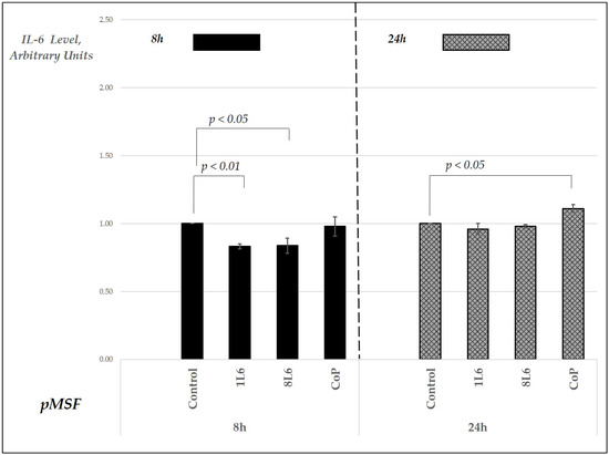 Secreted IL-6 levels in pMSF cell cultures grown on LPP films (1L6, 8L6, and CoP), measured at 8 and 24 h of incubation. IL-6 levels are expressed in arbitrary units relative to the control (set to 1) and grouped by incubation time. Data represent mean values from a minimum of three experiments (n = 3–6), with error bars indicating the mean (SEM). Statistically significant differences compared to the control are indicated by the corresponding p-values displayed above the bars.
