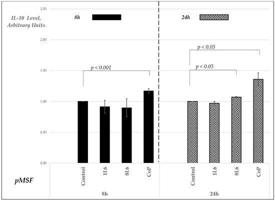 Secreted IL-10 levels in pMSF cell cultures grown on LPP films (1L6, 8L6, and CoP), measured at 8 and 24 h of incubation. IL-10 levels are expressed in arbitrary units relative to the control (set to 1) and grouped by incubation time. Data represent mean values from a minimum of three experiments (n = 3–6), with error bars indicating the mean (SEM). Statistically significant differences compared to the control are indicated by the corresponding p-values displayed above the bars.