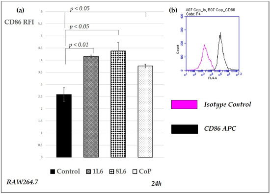 Surface expression of CD86 in RAW264.7 cells grown on control and LPP films (1L6, 8L6, and CoP). CD86 expression was evaluated by flow cytometry (BD Accuri C6) after 24 h of incubation. (a) On the Y axis, the relative fluorescence intensity (RFI) = mean fluorescence intensity (MFI) of CD86-APC/MFI of the isotype control is shown. The minimal number of experiments in each case was four. The columns show the mean (n = 10–13), while the bars show the mean (SEM). Statistically significant differences compared to the control are indicated by the corresponding p-values displayed above the bars. (b) Representative histogram overlay showing isotype control and CD86 expression in CoP-grown cell cultures. Magenta line: Isotype control; black line: CD86 APC.