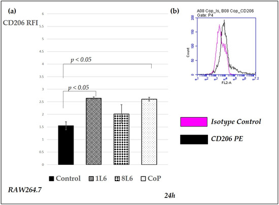 Surface expression of CD206 in RAW264.7 cells grown on control and LPP films (1L6, 8L6, and CoP). CD206 expression was evaluated by flow cytometry (BD Accuri C6) after 24 h of incubation. (a) On the Y axis, the relative fluorescence intensity (RFI) = mean fluorescence intensity (MFI) of CD206-PE/MFI of the isotype control is shown. The columns show the mean (n = 5–8), while the bars show the mean (SEM). Statistically significant differences compared to the control are indicated by the corresponding p-values displayed above the bars. (b) Representative histogram overlay showing isotype control and CD206 expression in CoP-grown cell cultures. Magenta line: Isotype control; black line: CD206 PE.