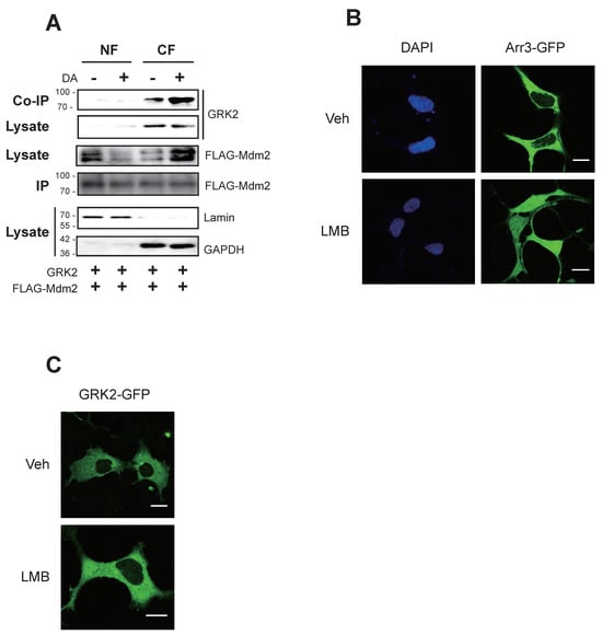 Arrestin3—not GRK2—harbors the NLS, suggesting distinct interaction mechanisms with Mdm2. Interaction between arrestin3 and Mdm2 in the nucleus was reported after agonistic stimulation of GPCRs such as D2R, β2 adrenoceptor (β2AR), and angiotensin type 1 receptor [12]. In a previous study, agonistic stimulation of D2R led to the ubiquitination of arrestin3. However, arrestin3 with a mutated NLS did not undergo ubiquitination (Figure S1) [12]. The interaction between GRK2 and Mdm2 observed during agonistic stimulation of D2R was analyzed through subcellular fractionation, revealing that this interaction occurs in the cytosolic fraction (Figure 1A). These findings were further corroborated by fluorescence microscopy. As depicted in Figure 1B,C, arrestin3 and GRK2 were primarily localized in the cytosol under basal conditions. In cells exposed to leptomycin B (LMB), an inhibitor of nuclear export, a fraction of arrestin3 was detected within the nucleus, whereas GRK2 remained localized in the cytoplasm (comparing vehicle- and LMB-treated cells).
