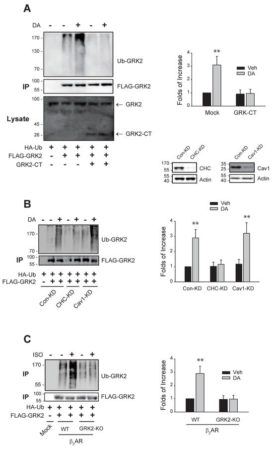 As shown in Figure 3A,B, the sequestration of Gβγ or knockdown of clathrin heavy chain (CHC)—not caveolin1 (Cav1)—inhibited the ubiquitination of GRK2. Finally, a mutant of β2AR, GRK2-KO-β2AR, in which GRK2-mediated phosphorylation sites (T360, S364, S396, S401, S407, and S411) were altered, failed to mediate GRK2 ubiquitination (Figure 3C), suggesting that receptor phosphorylation is also involved in the ubiquitination of GRK2.