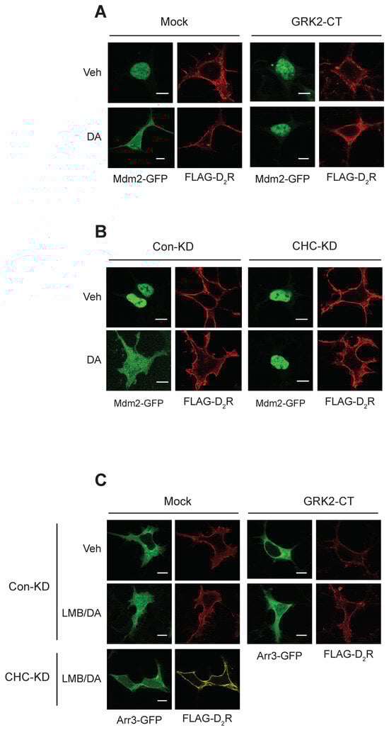 Initially, we investigated the impact of arrestins on the subcellular trafficking of Mdm2. As depicted in Figure 4A, under basal conditions, Mdm2 was primarily localized in the nucleus in cells expressing D2R, regardless of arrestin knockdown (Veh-treated groups). However, upon dopamine (DA) treatment, Mdm2 translocated from the nucleus to the cytosolic region (Figure 4A, DA-treated/Con-KD). Notably, this translocation was impeded by cellular arrestin knockdown (DA-treated/Arr-KD).