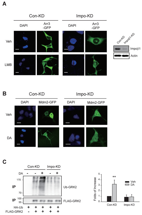 Mdm2, which was located within the nucleus in the basal state (Figure 8B, Veh/Con-KD), was located in both the nucleus and cytosol after DA treatment (DA/Con-KD). Upon knockdown of cellular importin β1, the localization of Mdm2 was detected in both the cytosol and nucleus in the basal state (Figure 8B, Veh/Impo-KD cells), suggesting that a portion of Mdm2’s nuclear entry under basal conditions was compromised. Because Mdm2 was already situated in the cytoplasm under basal conditions in importin β1-KD cells, it was challenging to conclusively ascertain whether nuclear export was further augmented by DA treatment.