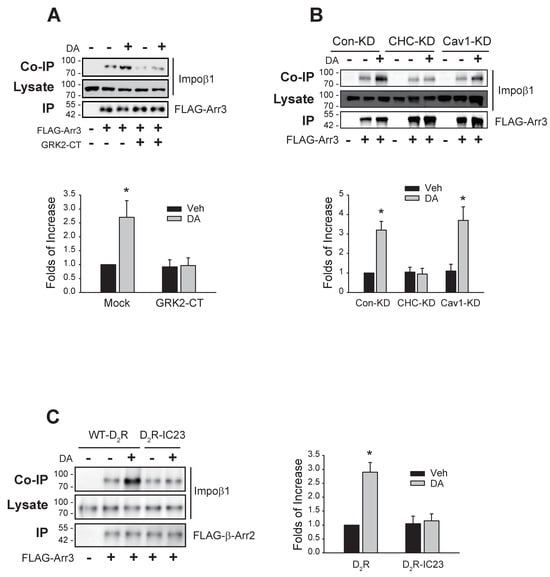 Roles of Gβγ, CHC, and receptor phosphorylation in the interaction between importin β1 and arrestin3. (A) HEK-293 cells expressing D2R were transfected with FLAG-arrestin3, along with a mock vector or GRK2-CT. Cells were treated with either vehicle or 10 μM DA for 2 min. Cell lysates were immunoprecipitated with FLAG beads. Co-IP/lysates and IPs were immunoblotted with antibodies against importin β1 and FLAG, respectively. * p < 0.05 compared to the Veh/Mock group (n = 3). (B) Con-KD, CHC-KD, and Cav1-KD HEK-293 cells transfected with D2R and FLAG-arrestin3. Cells were treated with either vehicle or 10 μM DA for 2 min. * p < 0.05 compared to the corresponding vehicle-treated group and CHC-KD cells (n = 3). (C) HEK-293 cells were transfected with FLAG-arrestin3, together with WT-D2R or D2R-IC23. Cells were treated with either vehicle or 10 μM DA for 2 min. * p < 0.05 compared to other groups (n = 3).
