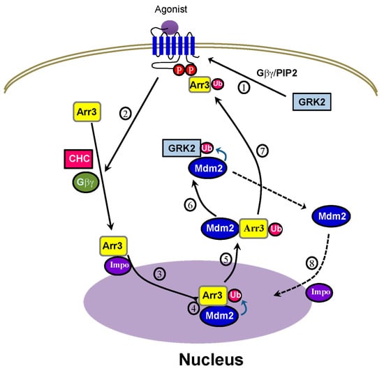 According to our experimental results, arrestin (Figure 2A)—in particular, its ubiquitination (Figure 2B)—is required for the ubiquitination of GRK2. Hence, it can be inferred that the factors governing the nuclear entry of arrestin3 (steps 1 and 2), crucial for its ubiquitination, likewise influence the ubiquitination of GRK2. This hypothesis was, indeed, confirmed by our study findings (Figure 5 and Figure 8). As Mdm2 is a nuclear protein and both arrestin3 and Mdm2 contain NES, it is presumed that Mdm2 and ubiquitinated arrestin 3 relocate from the nucleus to the cytoplasm, driven by the concentration gradient or with the help of exportin powered by the energy of GTP [36,37] (step 5, Figure 5B).