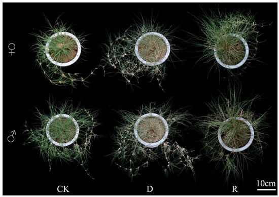 The phenotypic changes in B. dactyloides. CK—normal growth, D—drought treatment for 14 days, R—rewatering treatment for seven days, ♀—female B. dactyloides, and ♂—male B. dactyloides, the same below.