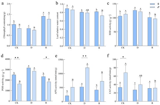 Changes in chlorophyll and relative water content of B. dactyloides leaves. (a) Changes in chlorophyll; (b) leaf relative water content change; (c) SOD activity; (d) POD activity; (e) APX activity; (f) CAT activity. Lowercase letters indicate differences between different treatments of female B. dactyloides (p < 0.05). Capital letters indicate differences between different treatments of male B. dactyloides (p < 0.05). * indicate differences between female and male B. dactyloides (p < 0.05). ** indicate differences between female and male B. dactyloides (p < 0.01).