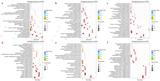 GO enrichment of DEGs in drought and rewater treatment between female and male B. dactyloides in biological process. (a) GO enrichment of DEGs unique to female CK vs. D; (b) GO enrichment of DEGs unique to female D vs. R; (c) GO enrichment of DEGs among to female CK vs. D vs. R; (d) GO enrichment of DEGs unique to male CK vs. D; (e) GO enrichment of DEGs unique to male D vs. R; (f) GO enrichment of DEGs among to male CK vs. D vs. R.