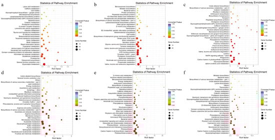 KEGG pathway enrichment of DEGs unique to B. dactyloides. (a) KEGG pathway enrichment of DEGs unique to female CK vs. D; (b) KEGG pathway enrichment of DEGs unique to female D vs. R; (c) KEGG pathway enrichment of DEGs among to female CK vs. D, CK vs. R, D vs. R; (d) KEGG pathway enrichment of DEGs unique to male CK vs. D. (e) KEGG pathway enrichment of DEGs unique to male D vs. R; (f) KEGG pathway enrichment of DEGs among to male CK vs. D, CK vs. R, D vs. R.