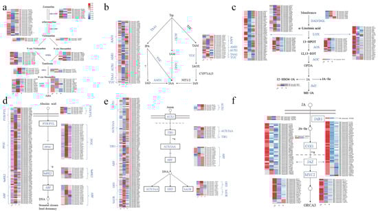 Analysis of DEGs related to plant hormone biosynthesis and signal transduction pathways. (a) Expression patterns of DEGs involved in ABA biosynthesis pathways (b) Expression patterns of DEGs involved in ABA signaling pathways; (c) Expression patterns of DEGs involved in auxin biosynthesis pathways; (d) Expression patterns of DEGs involved in auxin signaling pathways; (e) Expression patterns of DEGs involved in JA biosynthesis pathways; (f) Expression patterns of DEGs involved in JA signaling pathways. The left side of the pathway is the female plant and the right side is the male plant.
