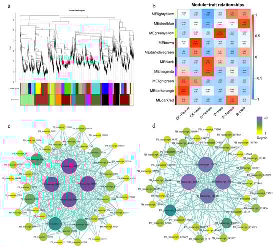 We conducted WGCNA analysis using biomarker Cloud to understand the potential molecular regulatory mechanisms between male and female plants of B. dactyloides under drought stress. We selected all DEGs (FPKM > 1) from 18 samples and used different treatments as reference traits. The minimum gene module was 30, with a module similarity of 0.25. The cluster tree diagram identified 10 different modules (Figure 6a), a correlation heatmap was created between modules and traits, with the greenyellow module showing a positive correlation with drought treatment in D-male and the magenta module showing a positive correlation with drought treatment in D-female. The steelblue module shows a positive correlation with rewatering treatment in R-male. The darkorange module and brown module showing a positive correlation with CK treatment in CK-female (Figure 6b). Considering the correlation between modules and traits and the proportion of genes within the modules, we chose the magenta module and greenyellow module as key modules for the response to drought stress and drought recovery ability of B. dactyloides. Using Cytoscape screen out eight key genes for two modules: PB_transcript_160085, PB_transcript_75052, PB_transcript_121221, PB_transcript_17674, PB_transcript_142867, PB_transcript_128934, PB_transcript_24526, PB_transcript_101250. (Figure 6c,d).