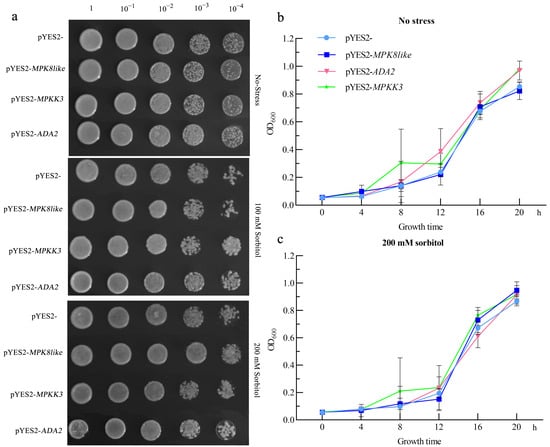 For yeast transformation, Y187 receptive cells were prepared and transformed with the plasmids. The transformants were plated on SD/-Ura plates and cultured to select positive clones. Single colonies of positive recombinant plasmid and control plasmid pYES2 were selected and expanded in SD/-Ura liquid screening medium to achieve OD600 of 0.5. After the bacterial solution was diluted to 10, 10−1, 10−2, 10−3, 10−4 times, the coating plate was cultured on SD/-Ura, SD/-Ura with 100 mM sorbitol, and SD/-Ura with 200 mM sorbitol, and the yeast growth phenotype was observed at 30 °C for 3d.