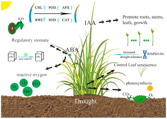 The use of transcriptomics technology to mine plant resistance genes has become a hot spot []. In this study, we applied WGCNA to analyze transcription factor-related genes in B. dactyloides and identified key genes (Figure 6). It was confirmed that the BdMPK8-like gene could enhance drought resistance of B. dactyloides by yeast transformation experiment (Figure 7). The MAPK cascades play pivotal roles in plant stress responses []. Mitogen-activated protein kinases (MAPKs or MPKs) diversify plant signaling pathways, enabling plants to respond to external signals through phosphorylation processes crucial for growth and development in complex environments []. MAPKs are known for their essential roles in plant development and stress responses [,]. They are associated with various kinases that enrich plant signal transduction pathways, adapting plants to complex environmental conditions []. MAPK family members have been extensively studied in Arabidopsis [], Oryza sativa [], and Fragaria vesca []. For instance, AtMPK6 and AtMPK4 in Arabidopsis thaliana mediate tolerance to low temperatures and salt stress []. The involvement of MAPKs in plant responses to drought stress has attracted considerable attention. In Arachis hypogaea, the AhMAPK13 gene is significantly induced under drought stress []. In Gossypium hirsutum, the GhMAP3K14-GhMKK11-GhMPK31 MAPK cascade responds to drought stress []. BdMPK8-like identified in B. dactyloides has been validated as a critical gene for drought resistance. Similarly, in rice, MAPK10.2 acts at the intersection of two MAPK cascades, enhancing drought resistance and drought tolerance []. Additionally, transgenic plants overexpressing StMAPK11 exhibit increased activities of antioxidant enzymes (SOD, CAT, POD, and PRO) under drought stress, significantly improving drought resistance []. As shown in Figure 8, based on our research results, we established a model figure of the changes in antioxidant enzymes and hormones in B. dactyloides under drought stress.