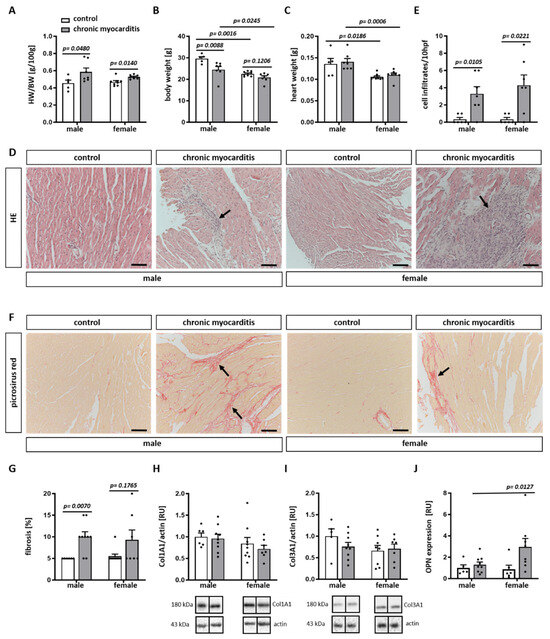 Hematoxylin/eosin staining revealed an increased number of cell infiltrates in the myocardial tissue of male and female CVB3-infected mice (p = 0.0105 and 0.0221, respectively) (Figure 1D,E). In accordance with the increased number of infiltrates, male and female mice with CVB3-induced chronic myocarditis showed higher amounts of pathological fibrosis in the myocardium in comparison to uninfected mice. However, only male mice showed a significant accumulation of fibrotic tissue (p = 0.0070) (Figure 1F,G). Col1A1 and Col3A1 expression was not affected by CVB3 infection (Figure 1H,I). Moreover, the OPN mRNA expression was significantly higher in CVB3-myocarditis females (p = 0.0127) (Figure 1J).