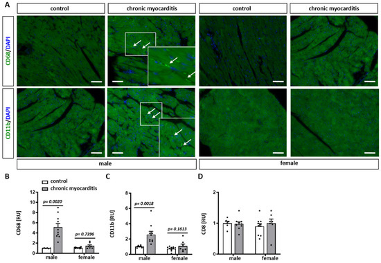 To further characterize the cell infiltrates observed in CVB3-activated chronic myocarditis in mice, staining with CD68, CD11b, and CD8 antibodies was performed. CD68 and CD11b, valuable markers of monocytes/macrophages in inflamed tissue, were significantly elevated in heart tissue of CVB3-treated male mice compared to untreated control (p = 0.002 and 0.0018, respectively) (Figure 2A–C). In female mice, increased CD68 and CD11b expression was observed but did not reach statistical significance (Figure 2A–C). In contrast, no differences in the expression of CD8, a marker for cytotoxic T cells, were determined in all groups investigated (Figure 2D).
