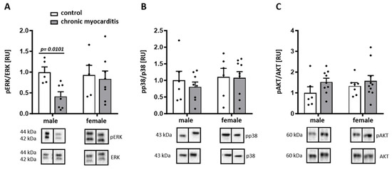 It has been shown that ERK, p38, and AKT signaling pathways play a significant role in cardiac remodeling [22,23] and are affected by CVB3-induced myocarditis [24,25]. Furthermore, sex hormones can modulate p38 and ERK signaling and thus may contribute to sex differences in the inflammatory processes [26,27,28]. Therefore, we first analyzed the phosphorylation, and thus the activation, of these kinases in myocardial tissue from male and female mice infected with CVB3. ERK phosphorylation was significantly decreased in male but not in female CVB3 mice (p = 0.0101) (Figure 3A), while the p38 and AKT phosphorylation remained unaffected by CVB3 infection in both male and female mice (p> 0.05) (Figure 3B,C).
