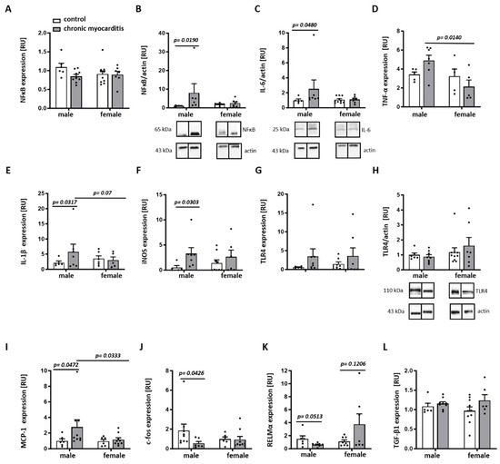 Similarly, the anti-inflammatory factor RELMα was decreased in CVB3-infected males in comparison to non-infected males, while female hearts expressed three times more RELMα (p = 0.0513 and 0.1206, respectively) (Figure 4K). No effects of chronic myocarditis on the expression of TLR4 or TGF-β have been found (p > 0.05) (Figure 4G–H,L).