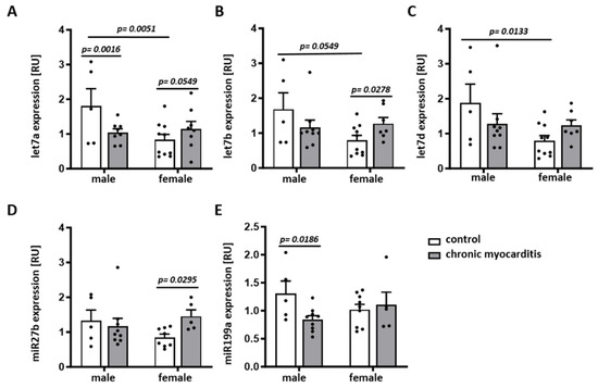 miRNAs are involved in the regulation of cardiac function, the immune response/inflammation (e.g., let7a, let7b, let7d, and miR199a) [7,29,30,31,32,33], and cardiac remodeling (e.g., miR27b, miR199a) [34,35,36]. Moreover, the expression of some miRNAs, like miR27b, is affected by estradiol [37]. Therefore, in this study, we examined sex differences in the expression of some miRNAs that are known to be involved in cardiac function, inflammation, fibrosis, and remodeling. In the CVB3-induced myocarditis group, the expression of the anti-inflammatory miRNA let7a was reduced compared to the control group in a sex-independent manner (p = 0.0016 and 0.0549) (Figure 5A). let7b, let7d, and miR27b were not affected by chronic myocarditis in male mice (p > 0.05), while the anti-inflammatory miRNA let7b and the remodeling-related miRNA miR27b were upregulated in females infected with CVB3 (p = 0.0278 and p = 0.0295, respectively) (Figure 5B,D). It is important to note that sex differences in the expression of let7a, let7b, and let7d were observed in the control group, with significantly higher expression in male mice (p = 0.0051, p = 0.0549 and p = 0.0133, respectively) (Figure 5A–C). The miR199a expression was significantly reduced only in male CVB3-infected mice (p = 0.0186) (Figure 5E).