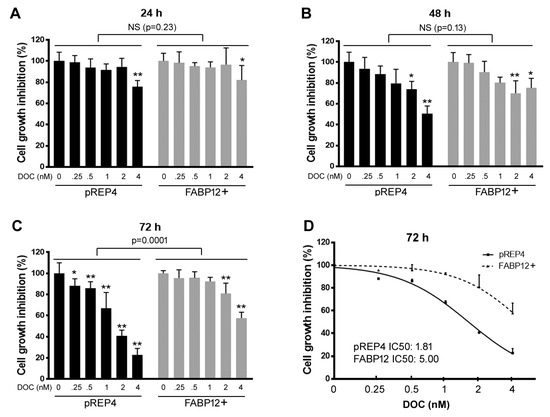 Cell growth suppression by docetaxel in PC3 stable transfectants. PC3 cells stably transfected with empty vector (pREP4) or pREP4 containing FABP12 cDNA encoding the entire FABP12 open reading frame (FABP12+) were cultured in 96-well plates in the absence (control) or presence of docetaxel (DOC, concentrations as indicated) for 24 (A), 48 (B) or 72 (C) hours. Cells were then stained with crystal violet and cell density analyzed with a microplate reader. Six wells were used for each concentration of docetaxel with two of the six wells left unstained and used as background controls. (D) IC50 for PC3-pREP4 and FABP12+ cells based on cell growth curves as a function of docetaxel treatment. Curves were generated with MS Excel. Each experiment was repeated at least three times. *, p < 0.05; **, p < 0.01.