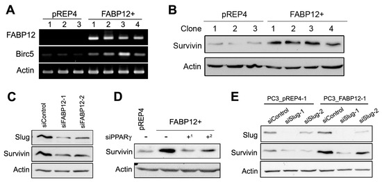 We previously found that the EMT-promoting transcription factor Slug is induced upon ectopic expression of FABP12 in PCa cells [15]. As FABP12 activates PPARγ, a fatty acid-activated nuclear transcription factor, and PPARγ knockdown significantly reduces Slug levels [15]; we next examined a possible relationship between PPARγ and Survivin by knocking down PPARγ in FABP12+ cells. PPARγ knockdown resulted in considerably reduced Survivin levels (Figure 2D). As Slug knockdown also reduced Survivin levels, especially in FABP12+ cells (Figure 2E), our data suggest a FABP12-PPARγ-Slug-Survivin regulatory axis in PCa cells.