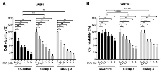 We have previously shown that FABP12 induces EMT in PCa cells through induction of Slug, a master transcription factor for EMT transformation [22]. We therefore asked whether Slug might also serve as a downstream effector of FABP12 in PCa cell response to docetaxel. To this end, we performed siRNA knockdown of Slug in PC3 control and FABP12+ cell lines, and then treated these cells with increasing concentrations of docetaxel. As expected, FABP12-mediated suppression of docetaxel-induced cell growth inhibition was observed in PC3 cells transfected with control siRNAs (panels with black bars in Figure 3A,B). Depletion of Slug by two different siRNAs had no effect on docetaxel sensitivity in pREP4 cells (panels with gray bars in Figure 3A); however, docetaxel-induced cell growth inhibition was significantly restored after Slug depletion in FABP12+ cells (siSlug-1, p < 0.0001; siSlug-2, p < 0.0001) (panels with gray bars in Figure 3B). These results are in keeping with Slug mediating PCa cell response to docetaxel through FABP12.