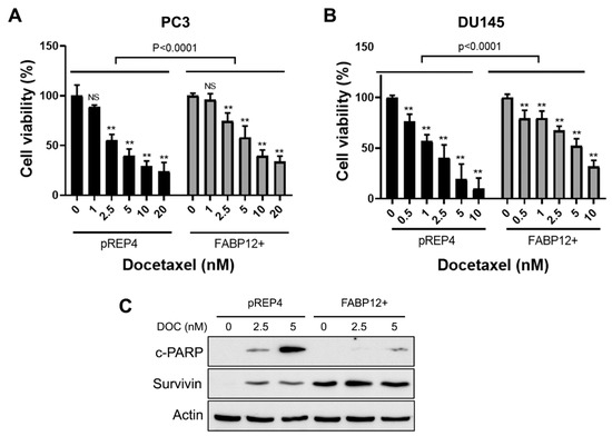 Analysis of the modulation of docetaxel-induced cell death by FABP12 in PCa cells. (A,B) Control (pREP4) and FABP12+ PC3 (A) and DU145 (B) cells were treated with docetaxel (DOC) at the indicated concentrations for 72 h. Cell viability was analyzed with the MTS assay kit (Promega). (C) Western blots showing the effects of FABP12 expression and docetaxel treatment on the expression of the apoptosis marker cleaved-PARP (c-PARP) and Survivin in DU145 stable transfectants. All docetaxel treatment experiments were repeated at least three times; ns denotes not significant; **, p < 0.001.