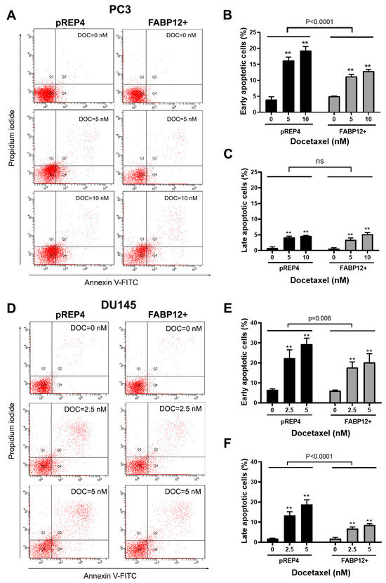 We then examined the effect of FABP12 on docetaxel-induced apoptosis in PC3 cells using Annexin V staining and flow cytometry. Cells were treated with 5 and 10 nM docetaxel for 72 h. A significant reduction in the percentage of early stage apoptotic cells (p < 0.0001) was observed in FABP12+ PC3 cells compared to pREP4 control cells (Figure 5A,B). In contrast to early stage apoptotic cells, we observed few cells in late stage apoptosis, with no difference in late stage apoptosis noted between pREP4 and FABP12+ PC3 cells treated with docetaxel (Figure 5A,C).