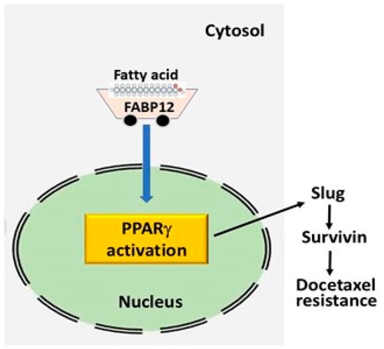 While there is no direct evidence to support interaction between PPARγ with the promoter region of SNAI2 (the gene encoding Slug) thereby directly regulating its transcription, we have identified at least two PPARγ binding sites within 1000 bp of the SNAI2 transcription initiation site using MatInspector [35]. We propose that FABP12 facilitates nuclear translocation of PUFA (e.g., arachidonic acid) and activates PPARγ. This, in turn, induces SNAI2 transcription, leading to EMT and drug resistance (Figure 7).