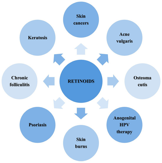 - Zasada, M.; Budzisz, E. Retinoids: Active molecules influencing skin structure formation in cosmetic and dermatological treatments. Postep. Dermatol. Allergol. 2019, 36, 392–397. [Google Scholar] [CrossRef]
