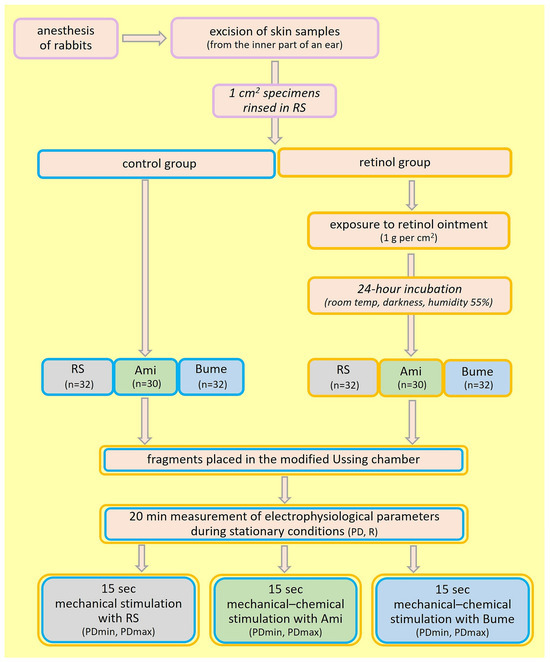 The examined skin specimens were cleaned and rinsed in RS, then exposed to the action of retinol ointment (1 g per 1 cm2) and left for 24 h at room temperature in the darkness, with a constant humidity of 55%. After this time, the analyzed skin fragments were placed in a horizontal position in a modified Ussing chamber filled with an incubation solution. The tested skin surface was 1 cm2. The modification of the chamber consisted of performing a series of stimulations of the stratum corneum with a liquid from a peristaltic pump with a fixed flow of 0.06 mL/s (1 mL/15 s). This research model imitated freely falling drops on the surface of the examined tissue. After 2 min, the electrophysiological parameters of the skin stabilized, and a series of stimulations was performed according to the experimental protocol (Figure 2). The experiment lasted 20 min for each fragment.