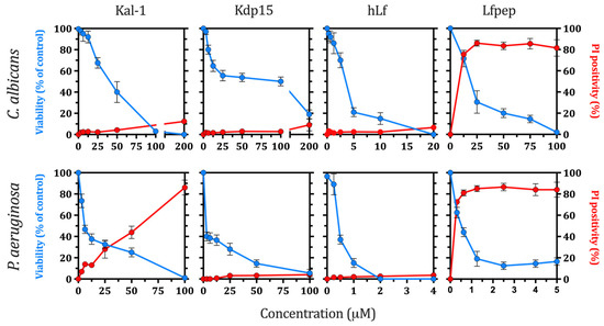 To determine whether Kal-1 and Kdp15 exert a permeabilizing effect on fungal or bacterial membranes, the cellular influx of the fluorescent nucleic-acid-binding dye propidium iodide (PI) was assessed. As PI itself cannot permeate through an intact phospholipid bilayer, only permeabilized cells take up PI, resulting in DNA intercalation and fluorescence. PI fluorescent cells were not significantly increased after incubation (90 min) with the range of concentrations of Kal-1, Kdp15, and hLf tested. This finding suggests that the integrity of plasma membrane was not substantially perturbed even at high microbicidal concentrations (Figure 1). However, a dose-dependent uptake of the fluorescent dye was observed for P. aeruginosa cells treated with ≥25 μM of Kal-1, suggesting a dual mechanism of action of this peptide that includes membrane permeabilization in this pathogen (Figure 1). hLf and Lfpep were used as negative and positive controls of membrane permeabilization, respectively [8,22]. A significant increase in PI fluorescent cells was observed after treatment with Lfpep, but a similar permeabilizing activity was not observed in hLf-incubated cells (Figure 1), even at concentrations 4 to 15 times higher than those found in human fluids [33]. This result indicates that, as previously described for lactoferrin [8,9,10], the microbicidal efficacy of Kal-1 and Kdp15 was not dependent on permeabilization of the cytoplasmic membrane. Meanwhile, P. aeruginosa cells were permeabilized by concentrations ≥25 μM Kal-1.