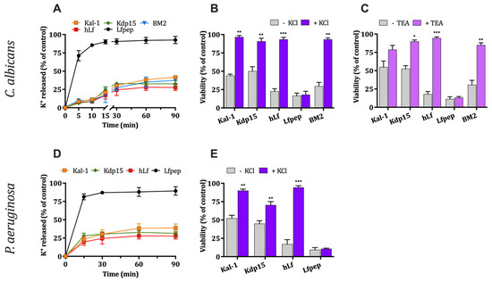 Potassium efflux induced by hLf γ-core-containing peptides. (A,D) Kinetics of K+ efflux. C. albicans or P. aeruginosa (107 cells/mL) were incubated with kaliocin-1, Kdp15, human lactoferrin (hLf), and Lfpep. hLf and Lfpep were used as negative and positive controls of the membrane permeabilization, respectively. The effect of antifungal BM2 peptide was evaluated. The extracellular K+ concentration was quantified at different times. (B,C,E) Effect of extracellular K+ and TEA+ on microbicidal activity. (B,E) microbicidal activity was assessed in Tris buffer in the absence or in the presence of 50 mM KCl or (C) 10 mM TEA+. Cell viability was determined by plating aliquots of the cell suspensions. The percentage of viable cells was determined relative to that for cells incubated without peptides (control). Results are the mean ± SD from duplicates of at least three independent determinations. * p < 0.05, ** p < 0.01, and *** p < 0.001 were used.