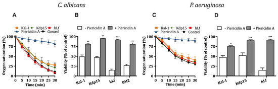 Data obtained from suspensions of C. albicans and P. aeruginosa exposed to microbicidal concentrations of Kal-1 or Kdp15 showed oxygen consumption equal to that of untreated (control) cells for at least 30 min (Figure 3A,C). In positive control assays, cellular respiration was inhibited by piericidin A, an inhibitor of the first respiratory chain complex (i.e., NADH I dehydrogenase) in both species. Negative control assays showed the inability of the native protein hLf to inhibit this cellular process, as previously reported [9,10].