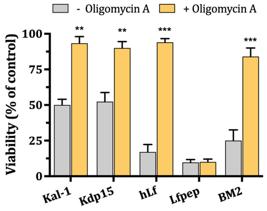 Effect of inhibition of mitochondrial ATP synthase on the candidacidal activity of hLf γ-core-containing peptides. Candidacidal effect of IC50 of kaliocin-1 (Kal-1) and Kdp15 and 0.25 μM BM2 on cells (106 cells/mL) pre-incubated without or with 16 μg/mL oligomycin A. Cell viability was determined by plating aliquots of the cell suspensions and the percentage of viable cells was determined relative to that for cells incubated without peptides. Human lactoferrin (hLf) and Lfpep were used as positive and negative controls, respectively. Data are the mean ± SD from at least three experiments. ** p < 0.01, and *** p < 0.001 were used.