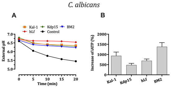A whole-cell proton transport assay was used to evaluate the possible inhibition of the fungal plasma membrane Pma1p H+-ATPase by Kal-1 and Kdp15. In control assays (without peptides), the medium of starved C. albicans cells treated with glucose was acidified primarily by the active H+-transport via PM Pma1p H+-ATPase. Extracellular acidification was monitored with a pH electrode showing a progressive decrease reaching ~1.3 pH units at 20 min. However, this acidification was substantially lower in yeast pre-incubated with either kaliocin-1 or Kdp15, with a decrease of approximately 0.5 pH units after 20 min (Figure 5A). In agreement with previously reported observations, control assays performed with cells pre-incubated with hLf and BM2 peptide showed a similar inhibition of H+-extrusion via Pma1p H+-ATPase [10,31,32].