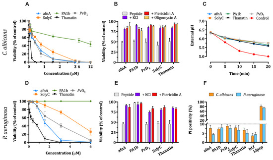 For this purpose, the yeast Candida albicans and the Gram-negative bacterium Pseudomonas aeruginosa, both of which are aerobic microorganisms and important human opportunistic pathogens, were exposed to kaliocin-1 and selected kaliocin-1-derived peptides (Kdp) to evaluate their microbicidal efficacy and mechanisms. The structure–activity relationships associated with cell death and the influence of extracellular conditions were compared to those previously described for human lactoferrin and BM2 peptide, two PM H+-ATPase inhibitors [9,10,31]. Finally, we tested other Cys-rich AMPs or their derivate fragments, containing complete γ-core motifs, to evaluate their possible inhibitory activity on microbial H+-ATPases.
