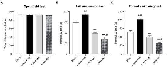 Assessment of locomotor activity and depression-like behavior: (A) Locomotion of mice was evaluated using an open-field test. The effects of G-Rc on depressive behavior were assessed using the (B) tail suspension test and (C) forced swimming test. Immobility time in both tests implies depression-like behavior. Results are expressed as the mean ± SEM; N = 5 per group; ## p < 0.01 and ### p < 0.001, significantly different from the sham control group (sham); *** p < 0.001, significantly different from the vehicle-treated group (L-AAA + Veh); † p < 0.05 and †† p < 0.01, significantly different from the IMI-treated group (L-AAA + IMI). G-Rc, ginsenoside Rc; L-AAA, L-alpha-aminoadipic acid; TST, tail suspension test; FST, forced swimming test; SEM, standard error of the mean; IMI, imipramine.