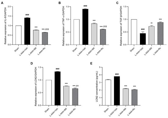 The thermal cycling conditions were as follows: initial denaturation at 95 °C for 10 m, followed by 40 cycles of 95 °C for 15 s and 60 °C for 1 min. A melting curve analysis was performed to verify the specificity of the amplification. The relative expression levels of target genes were normalized to the expression of the housekeeping gene GAPDH and analyzed using the 2−ΔΔCt method. The sequences used were as follows: IL-6 (GenBank No: NM_031168): F, 5′-AGTTGCCTTCTTGGGACTGA-3′, R, 5′-TCCACGATTTCCCAGAGAAC-3′; TNF-α (GenBank No: NM_013693): F, 5′-ATGGCCTCCCTCTCAGTTC-3′, R, 5′-TTGGTGGTTTGCTACGACGTG-3′; TGF-β (GenBank No: NM_011577): F, 5′-CTCCCGTGGCTTCTAGTGC-3′, R, 5′-GCCTTAGTTTGGACAGGATCTG-3′; LCN2 (GenBank No: AA087193): F, 5′-ATGTCACCTCCATCCTGGTC-3′, R, 5′-CACACTCACCACCCATTCAG-3′; GAPDH (GenBank No: NM_008084): F, 5′-TGGGCTACACTGAGCACCAG-3′, R, 5′-GGGTGTCGCTGTTGAAGTCA-3′.
