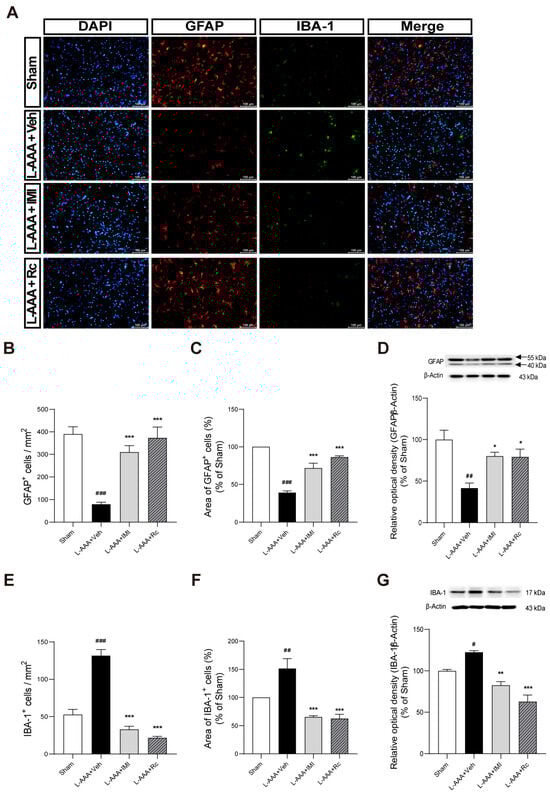 After L-AAA injection, decreased levels of glial fibrillary acidic protein (GFAP) and increased levels of adjacent ionized calcium-binding adapter molecule 1 (IBA-1) were observed using immunofluorescence staining (Figure 3A). The number and the area of GFAP-positive cells significantly decreased after L-AAA injection (p < 0.001, Figure 3B,C), while the number and the area of IBA-1-positive cells significantly increased compared to the sham group (p < 0.001, Figure 3E,F). Conversely, mice treated with G-Rc and IMI displayed increased GFAP levels and decreased IBA-1 levels (p < 0.001). These results indicate that G-Rc alleviates astroglial impairment, potentially through the modulation of astrocyte–microglia crosstalk.